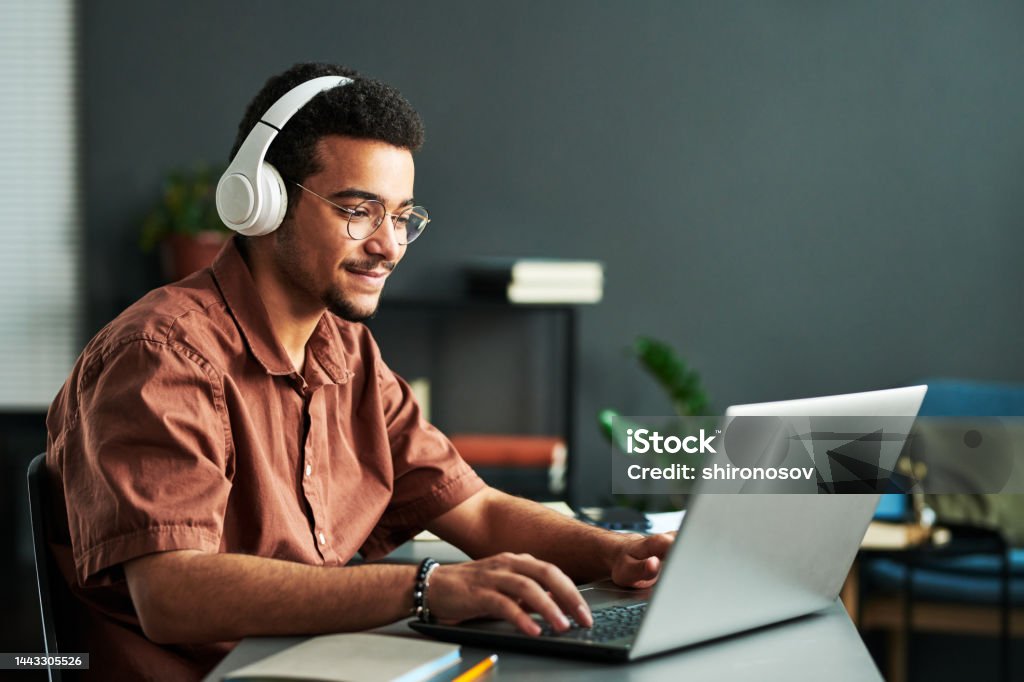 Young smiling man in headphones typing on laptop keyboard while sitting by workplace and taking part in online webinar or lesson